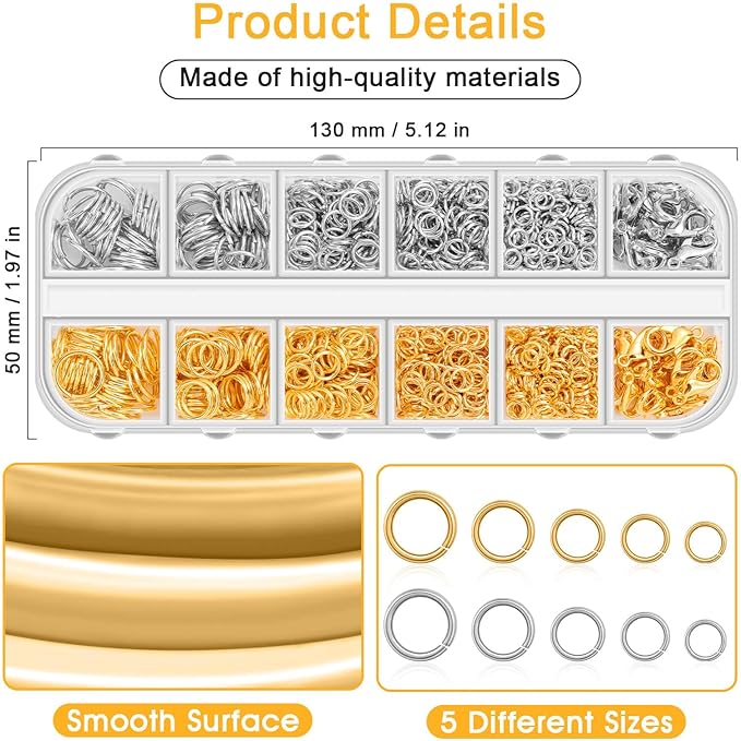 - NICE CONTAINER BOX: The jump rings for jewelry making are packed in a handy container to keep them separate and easy to find. The storage container is designed with the lids that can be opened and snapped shut individually as well as all together. It is perfect for both keeping the jewelry rings compartments with individual sizes and small enough to not to clutter your work area